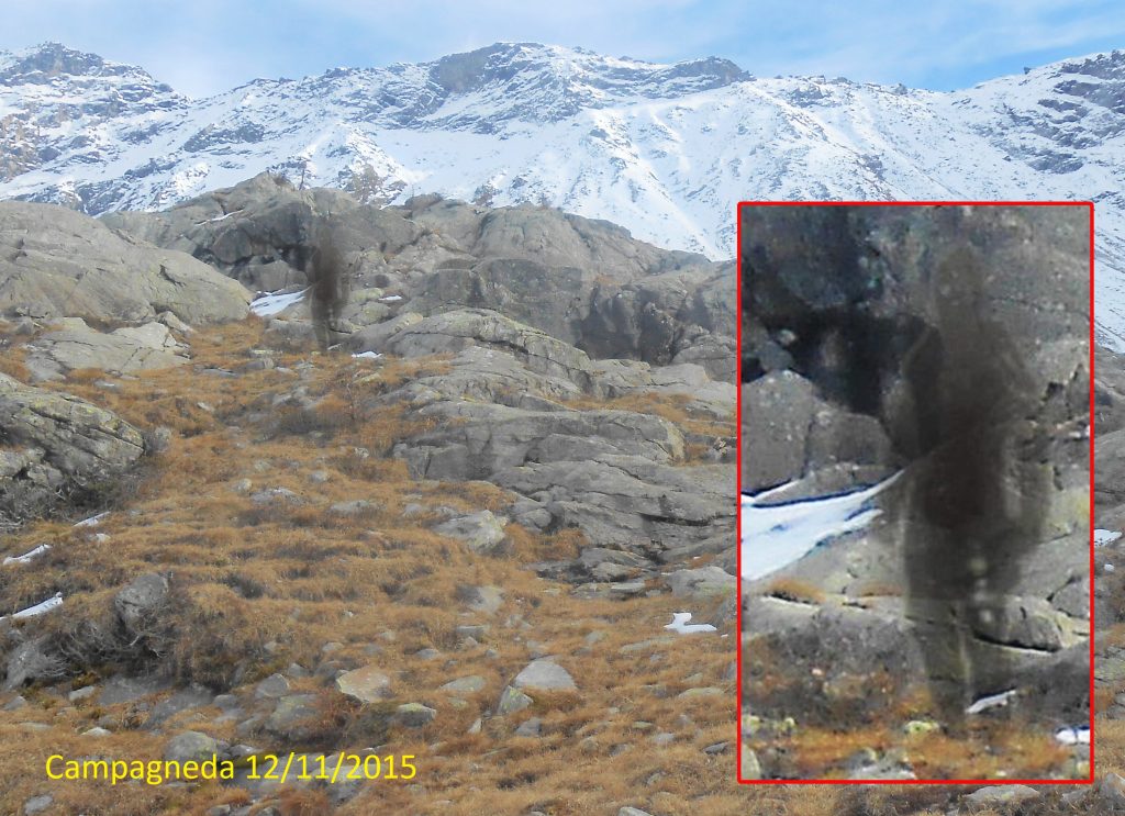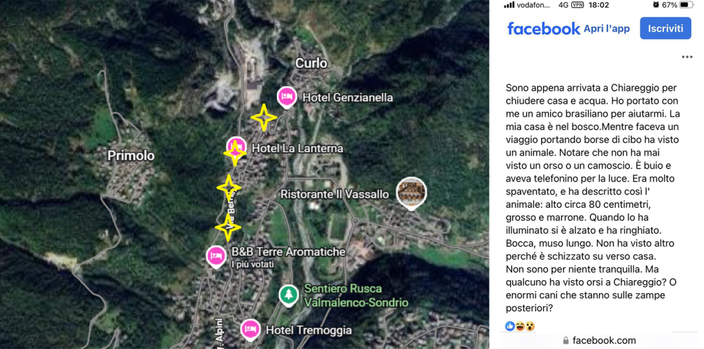 L’immagine n. 2, riporta la mappa della zona interessata. Sulla destra riproduce un post pubblicato su Facebook da un testimone di Chiareggio. Il messaggio è volutamente criptico e allusivo. È evidente che, nel periodo invernale gli orsi, soprattutto quelli di piccola taglia, non si muovono da soli, né tantomeno eretti su due zampe. La donna ha lanciato un segnale senza esporsi ulteriormente. Per quieto vivere di tutti quanti, le identità di tutti i testimoni sono state omesse. Saranno loro a decidere se, quando e come palesarsi e se dispongono eventualmente di fotografie.