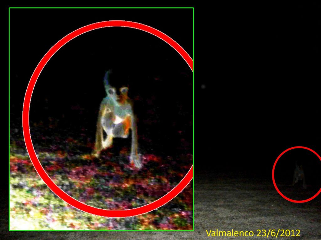 Durante l’illuminazione, un velivolo è chiaramente visibile mentre transita sopra l’area. Lo sconcerto è totale. Gli esseri non umani fuggono rapidamente in una direzione, mentre padre e figlio si allontanano nella direzione opposta. A quel punto decidono di desistere e rientrare in casa.