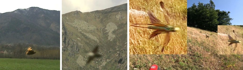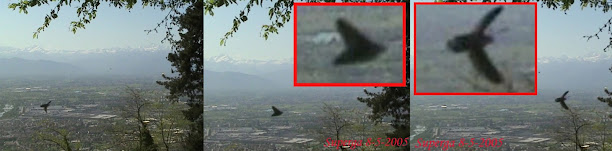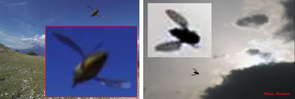 Presento ora, tratti da un video, tre fotogrammi con tre diverse varianti estetiche che evidenziano meglio quanto detto. Da notare, come questa entità, si presenta completamente nera, quando vola a velocità moderata, mentre le ali diventano prima chiare e poi trasparenti quando la velocità è alta. In altri casi sono state riscontrate tipologie con altre colorazioni. Gioca un fattore importante l’angolazione della luce.