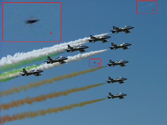 Nel riquadro 1 si evidenzia una comune scia aerea, dove però non si vede cosa la genera. Sotto, vediamo la parata della formazione acrobatica mentre genera scie per un fine puramente estetico. Nel riquadro 2, vediamo quello che viene indicato come ipotetico ufo. Certamente in quanto oggetto non identificato, ufo lo è certamente, purché non lo si consideri quale astronave. Ingrandendo come da riquadro 3, si evidenzia cosa è. E’ esattamente come quello dell’immagine n.2 ovvero, una entità “Beta”.