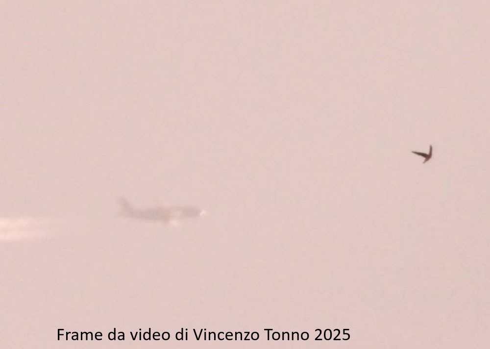 Complimenti all’autore che, osservando quanto stava avvenendo ha cercato di ottenere il massimo. Quindi vediamo mediante il riquadro rosso e posto in alto, l’attimo dell’entrata in scena. Poi vediamo mediante il riquadro in rosso sul lato sinistro, il frangente del formarsi della scia; generata da un misterioso oggetto che nulla ha di estetico con un aereo nostro.