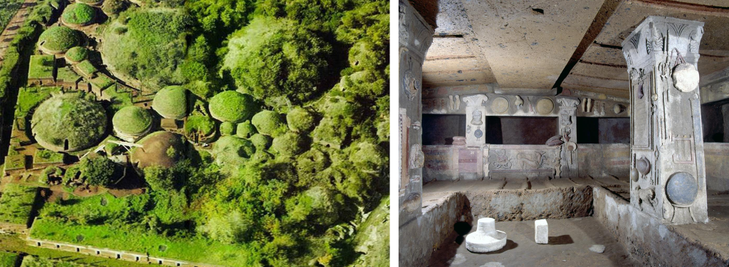 La soprastante fotografia ci fa vedere il villaggio della Banditaccia di Cerveteri. Di fianco l’interno di una tomba, come pure la foto uno. Molti anni fa ebbi occasione di visitare queste costruzioni. Ero in comitiva e ricordo un presente che commentò all’accompagnatore: veramente strani questi etruschi. Hanno trattato i defunti come fossero dei vivi, mentre trattavano i vivi come fossero dei defunti!