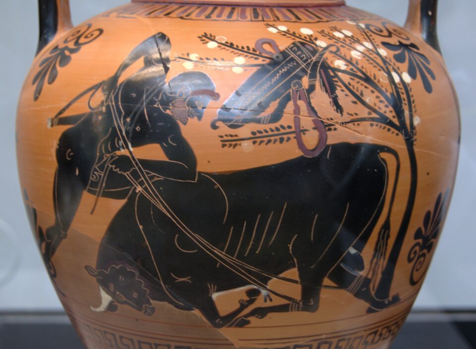 Mediante il soprastante vaso, vediamo la rappresentazione mitologica di Eracle che sconfigge il toro. Anche il toro era una figura mitologica che rappresentava una certa divinità. Tradotto mediante altre parole, significa che Eracle/Ercole, sconfisse la divinità detta Toro. Da qui Torino con i taurini. In Sardegna dentro le domus de janas sono visibili le rappresentazioni della testa del toro. Ad indicare che gli antichi sardi costruttori delle domus de janas, erano schierati dalla parte della divinità Toro e non certamente dalla parte di Eracle.