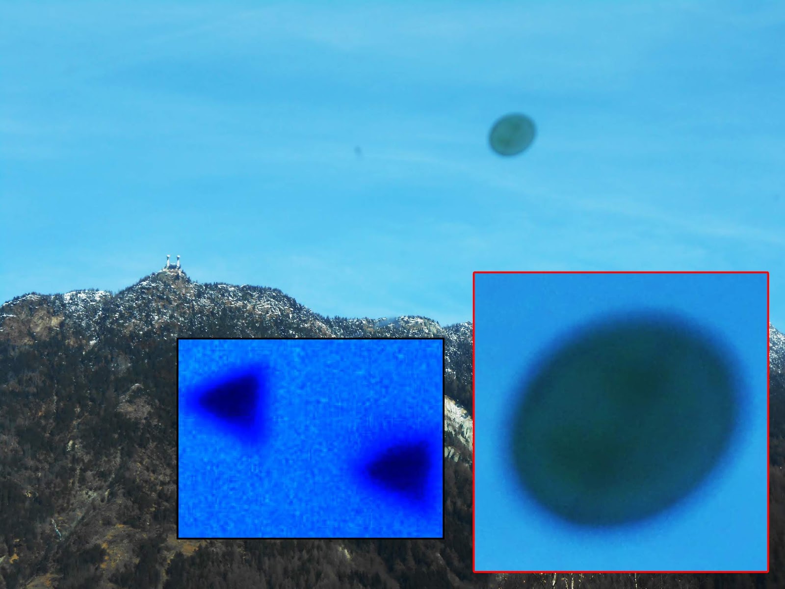 Si presenta come una delle molteplici varietà di triangoli neri ripresi frequentemente in zona. Non è chiaro se il triangolo tenta di intercettare il disco volante, motivo per il quale questo se ne va; oppure semplicemente il disco attendeva il triangolo quindi al suo sopraggiungere assieme se ne vanno.