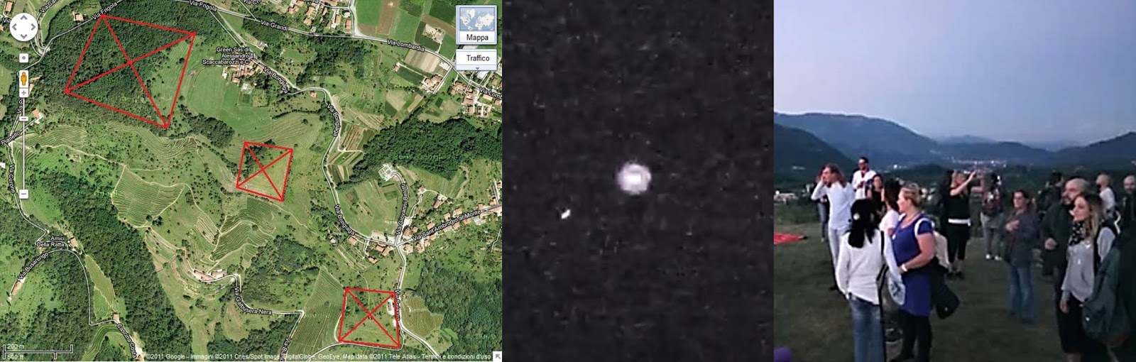 7: Montevecchia vista dall’alto e localizzazione delle tre piramidi. Quindi una delle luminosità riprese in occasione della meditazione di gruppo su di una delle piramidi e, una foto del gruppo che vi ha preso parte.