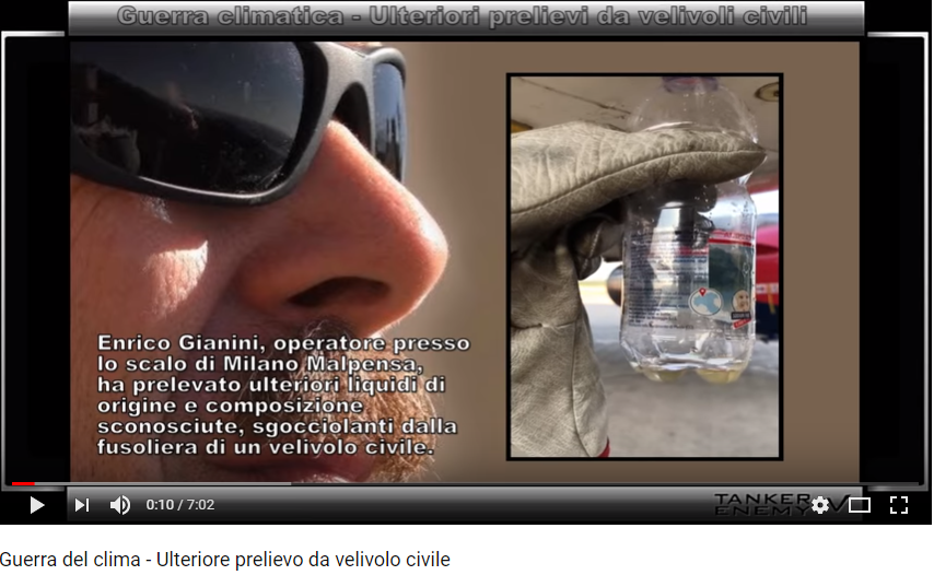 Quindi dalla presenza sugli aerei, di una impiantistica probabilmente inserita in fase successiva alla loro costruzione. Il materiale percolante è stato fatto analizzare, dal quale è emerso il fatto che si tratta di sostanze che sopra gli aerei non dovrebbero esistere. Pertanto siamo di fronte al fatto che le irrorazioni hanno carattere chimico, sono intenzionali, ma soprattutto non sono al momento giustificate in alcun modo. Non è il caso che io mi dilunghi nel dire quanto sostiene il Gianini, poiché è lui stesso a farlo personalmente mediante una serie di video posti in rete.