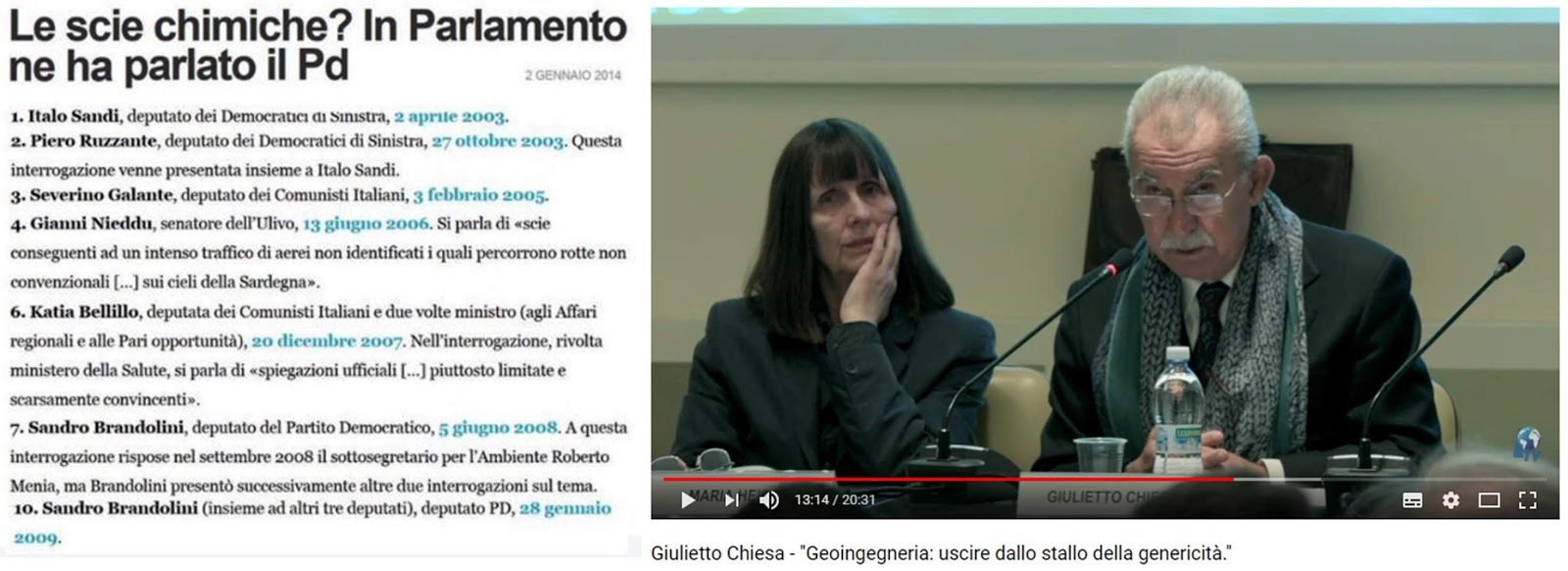 Tra i politici, con interrogazioni parlamentari, ci ha provato l’On. Domenico Scilipoti a richiedere l’annullamento del Segreto di Stato sulle scie chimiche; ma senza risultato. Una strenua battaglia è stata condotta da Giulietto Chiesa, https://www.youtube.com/watch?v=cb7f714N2qs Video sopra il quale consiglio di seguire con attenzione. A livello non politico si sono distinti i fratelli Marcianò, Corrado Penna e molti altri, assieme ad una schiera di partigiani, detti appunto complottisti. Nonostante i numerosi tentativi per indurre i rappresentanti dello Stato Italiano ad assumere posizione chiarificatrice se non contraria, la situazione era e resta comunque stagnante. Ora però sono avvenuti alcuni nuovi fatti di notevole portata che, vanno a scuotere la precedente stasi.
