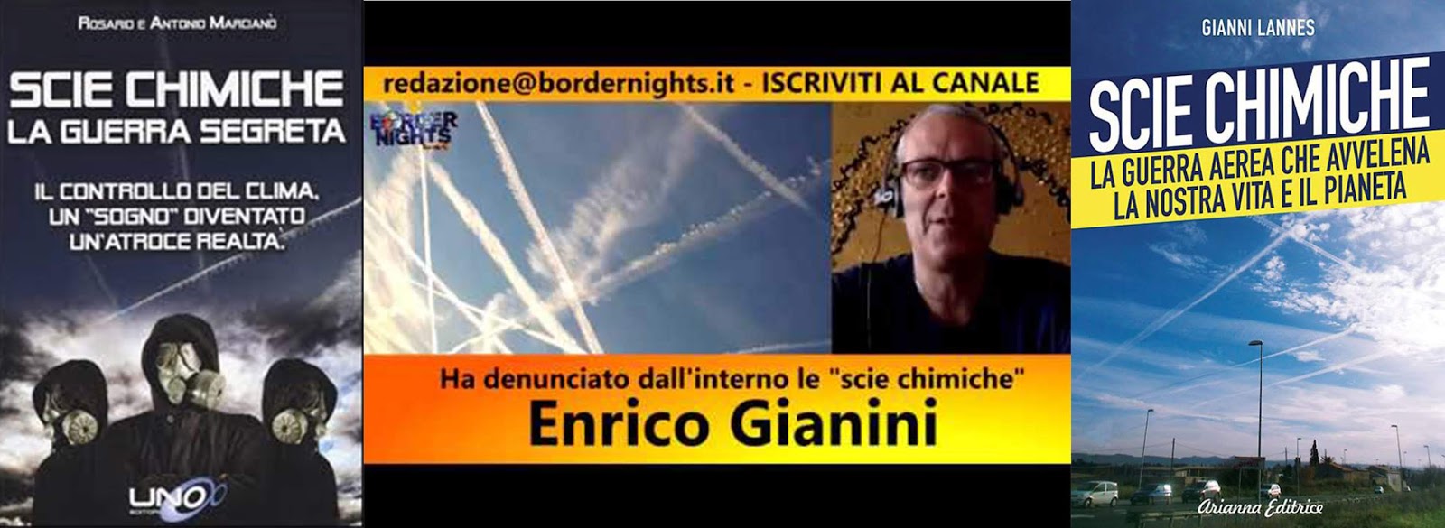 Il signor Enrico Gianini è l’operatore aeroportuale della Malpensa ora sospeso, il quale primo in Italia e forse nel mondo, a totale costo e rischio personale, ha portato fuori dall’aeroporto, le prove oggettive e incontestabili che è in corso una operazione di aerosol o irrorazione del cielo mediante aerei di linea predisposti a doc. Le prove sono costituite dal prelevamento di sostante percolanti dagli aerei in questione, dalla costatazione visiva e fotografica degli ugelli preposti.