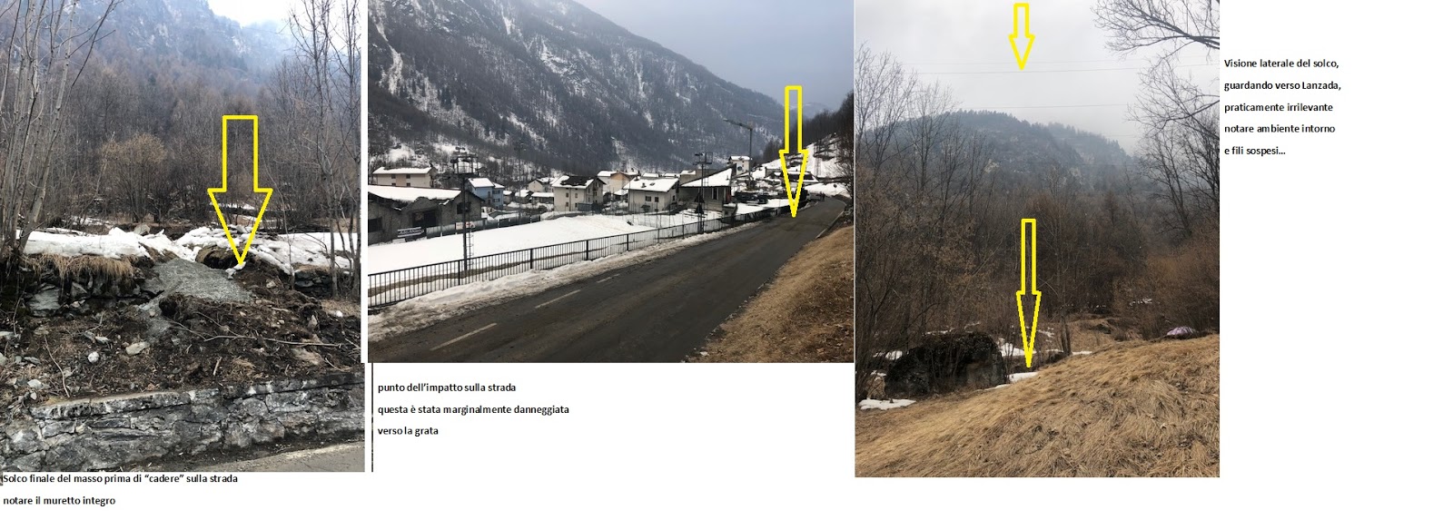 La foto 3/C ci fa vedere l’ultimo impatto del masso prima di fermarsi sulla strada. Il fatto che abbia generato una buca, significa che in quel punto non ci è arrivato scivolando, ma con un impatto da volo. Quindi impatta, si risolleva leggermente, quel tanto da poter scivolare lentamente, per adagiarsi sulla sede stradale!