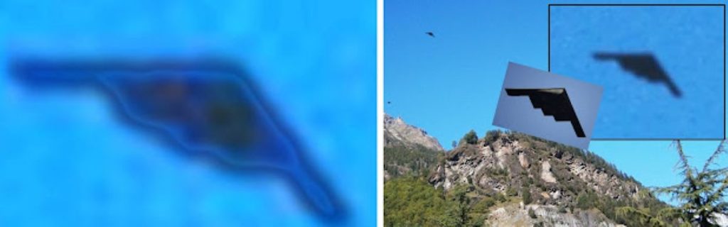 Quindi ora ancora non abbiamo risolto l’arcano. Il B-21 Raider in circolazione ha la coda a punta unica, pertanto non può essere quello di Cafasse e, neppure può esserlo quello a tre punte. Neppure può essere il B-2 Spirit, poiché quello di Cafasse si presenta più piccolo, troppo basso e fuori contesto logico. Quindi?