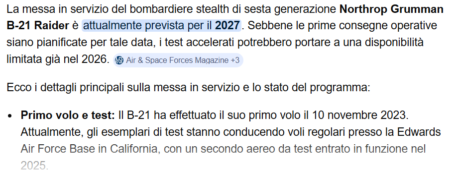 Errato dirà l’esperto osservatore portando la sottostante immagine a riprova: esiste anche il B-21 Raider di nuova generazione con la coda a tre punte. Qui però sorge altro problema che si evidenzia mediante la domanda: quando è stato posto ufficialmente in servizio questo velivolo? Risposta: è ancora in fase sperimentale e solamente in territorio USA.