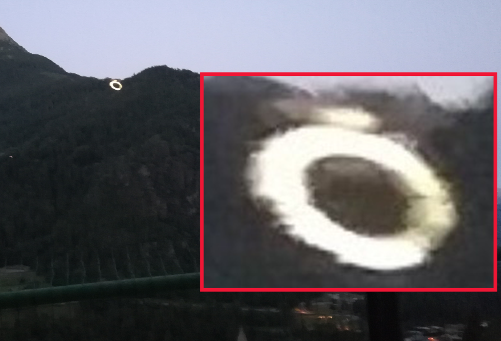Passa del tempo, ora si sta facendo buio. Si accendono le luci delle case. La ciambella è risalita in cima al monte retrostante e qui abbiamo prova circa la sua visibilità nonostante la distanza.