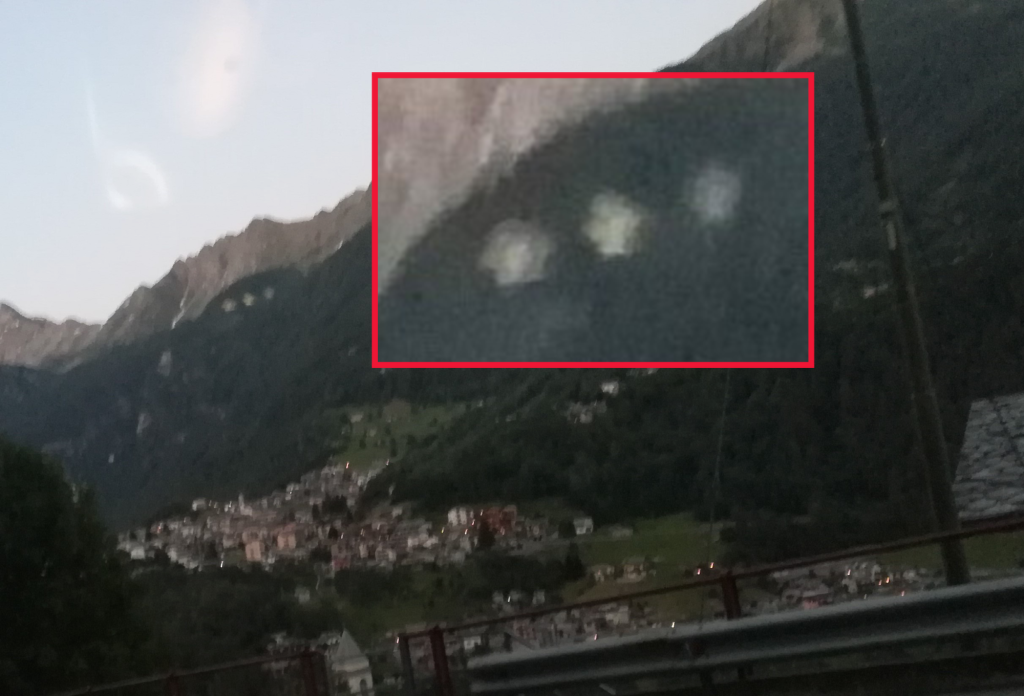 Mediante la foto soprastante, vediamo che il testimone si è portato fuori dalla interferenza della abitazione che stava di fronte. Ha agito sullo zoom; ed ecco che riprende questa strana presenza. L’estetica è bizzarra, a distanza parrebbe un corpo unico, ma ad attenta analisi, si presenta come una conseguenza estetica delle precedenti foto.