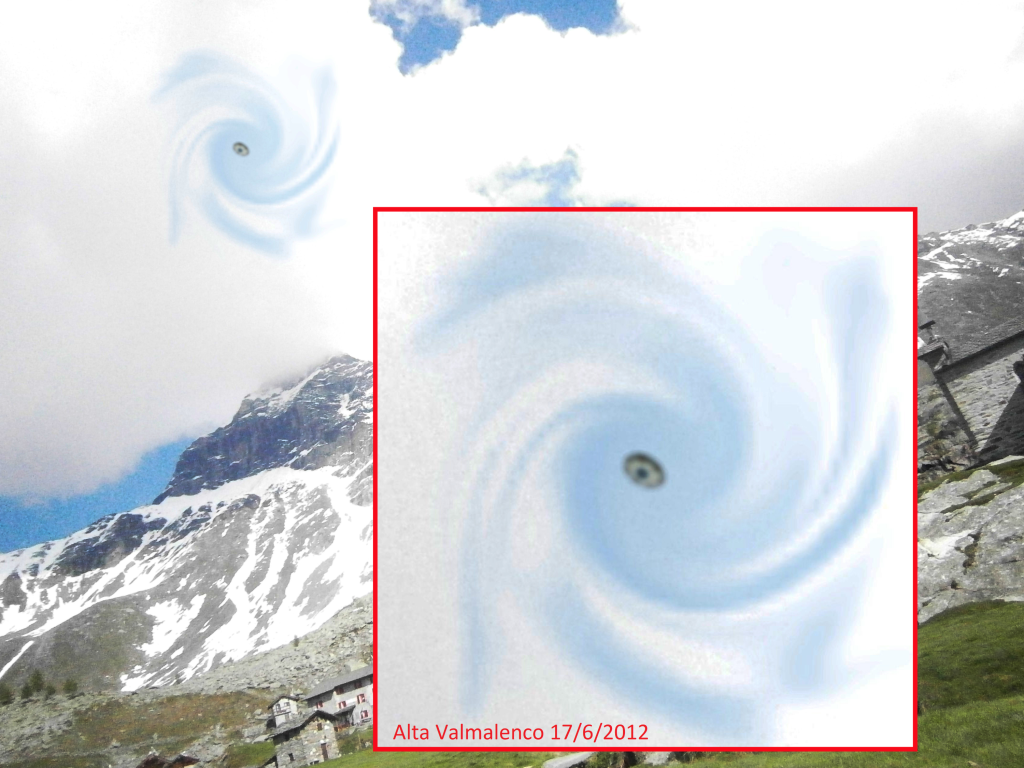 Nell’estate 2012 sono stati ripresi nel cielo della Valmalenco, particolari forme nuvolose vorticanti. La cosa ha generato sconcerto e interesse tra gli interessati. Nell’immagine sottostante, tre sono i vortici. Preciso che al momento dello scatto fotografico i vortici erano visibili a occhio nudo e non sono quindi manifestazioni fotografabili ma non visibili sulla frequenza della vista umana. Immediatamente la presenza del vortice viene accostata, da coloro che li hanno fotografati, alla concomitante presenza di ufo. Di primo acchito, si può quindi ipotizzare che i vortici sono eventuali forme di mimetizzazione utilizzate dalle intelligenze che gestiscono gli ufo.