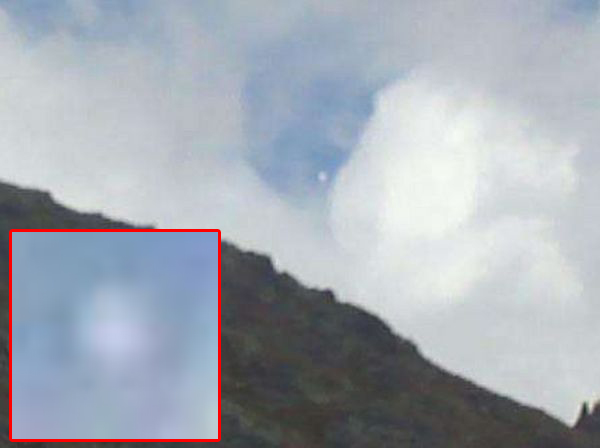 A questo punto il testimone avrebbe richiamato le altre persone che erano in precedenza con lui. Continua poi la dichiarazione: “Arrivati in cima, abbiamo visto un disco di circa dieci metri di diametro alzarsi in volo ed allontanarsi a grande velocità verso Pizzo Scalino senza fare alcun rumore”. Ecco ora l’eccezionale immagine (che definiamo B) del disco volante di fronte a Pizzo Scalino.