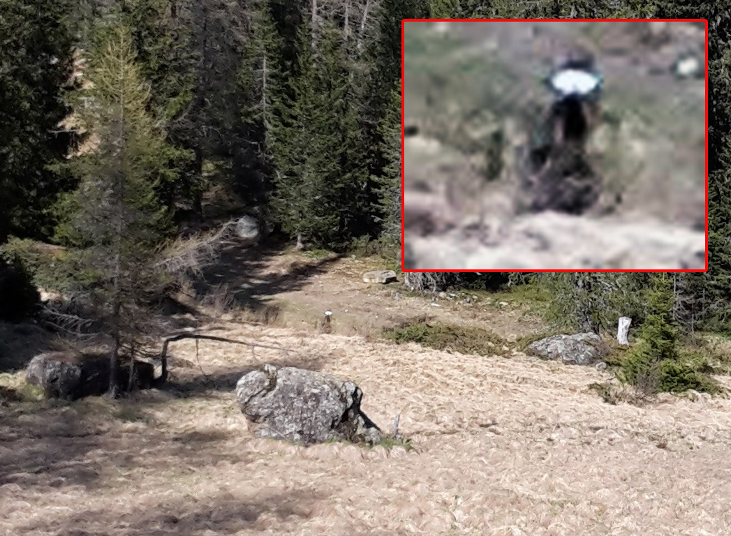 Il testimone giunto in questo luogo si è trovato a sua insaputa, di fronte alla presenza di molteplici entità del piccolo popolo. Una di queste, probabilmente la stessa visibile nell’ingrandimento, ha proiettato l’immagine del cervo, all’indirizzo della persona presente che, questo ha visto. La sua fotocamera però non ha abboccato e, ha ripreso quanto oggettivamente presente nell’ambito del fotografabile; in quanto non possiamo sapere cosa vi era oltre.